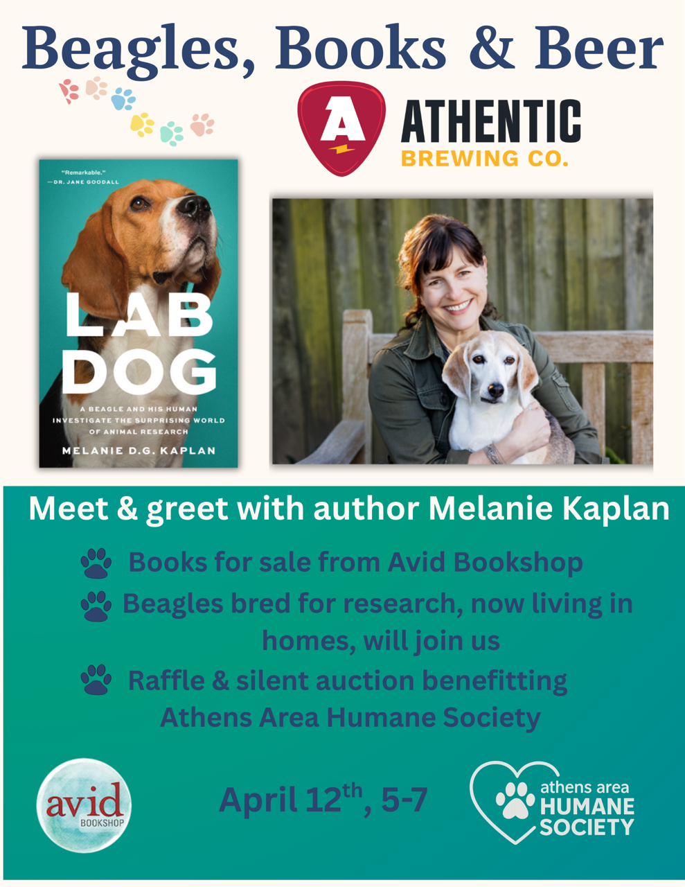 Join Avid at Athentic for a meet and greet with Lab Dog author Melanie Kaplan! You can grab books for sale from avid, as well as meet adorable Beagles bred for research. Plus there will be a raffle and silent auction benefitting the Athens Area Humane Society!